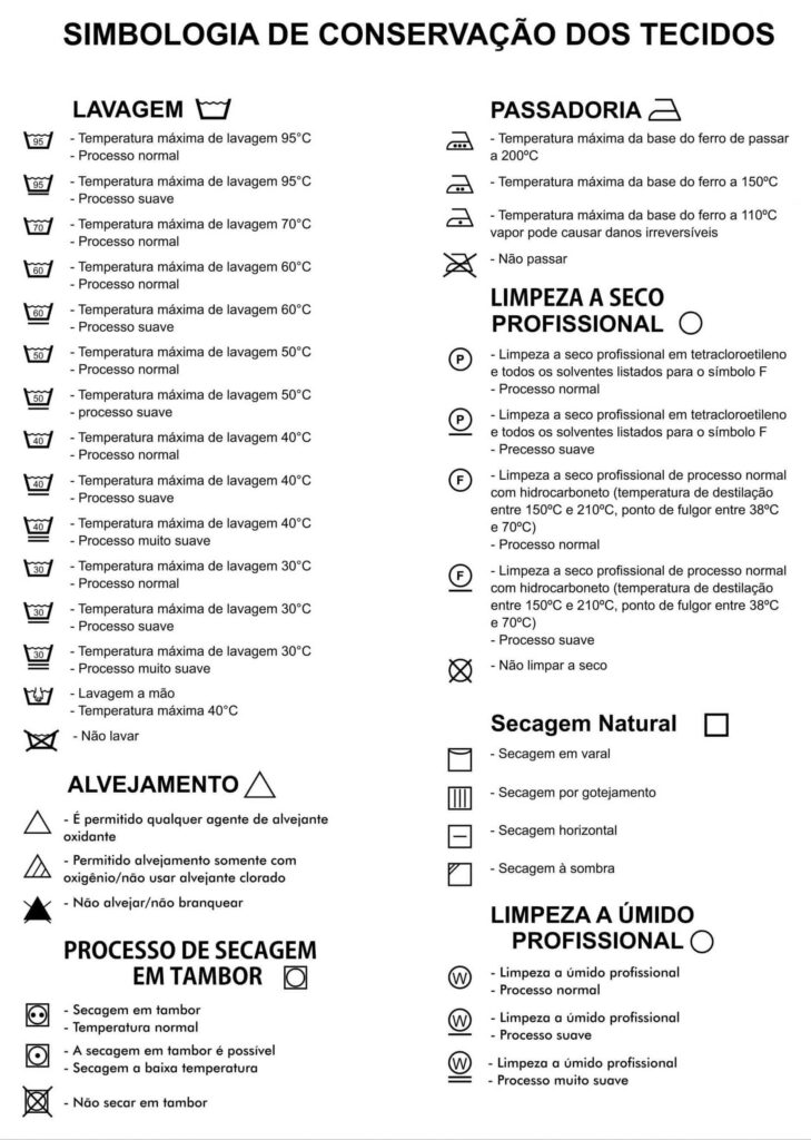 Nessas etiquetas há informações que mostram a porcentagem de composição da peça, referente as fibras ou filamentos têxteis que compõem os tecidos utilizados na confecção das roupas (por exemplo: 90% viscose e 10% elastano). As regras de tratamento, manuseio e cuidados para conservação na hora da lavagem também constam em nossas etiquetas, e estão indicadas por símbolos, que trazem informes sobre alvejamento, secagem, passadoria e tipos de limpeza.